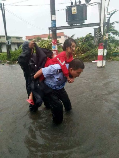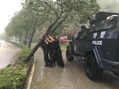16日16时许,惠州大亚湾区公安局民警李文龙与同事在石化园区巡查时发现一辆汽车在主干道上熄火,于是立即组织人员进行救援,将汽车推至路边,并将车上人员带离至安全地点。博罗交警大队福田中队在辖区巡查时,发现一摩托车司机被台风吹倒,迅速将人车转移到安全区域。