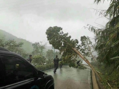 16日下午,受台风影响,国道G324线稔山三汾水路段树木被吹倒在路面,压断沿路电线,造成交通堵塞。惠州市惠东稔山交警确认电线无通电后,爬上大货车将电线捆好,并清理路面上的树木,在最短时间内恢复交通。