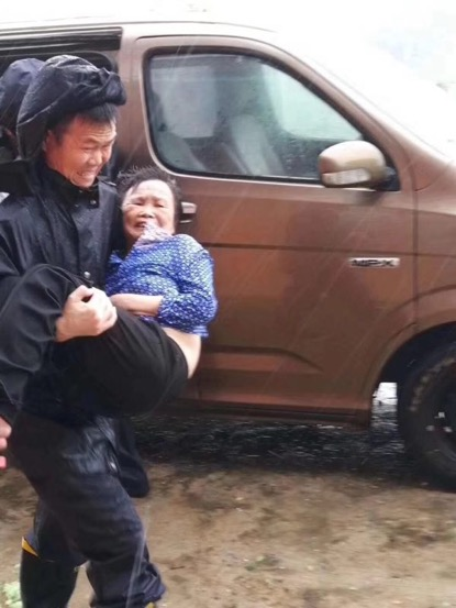 接报后,派出所迅速组织了3名民警以及2名辅警组成的救援队伍赶赴现场,在前往报警地点途中,因决堤原因,水面迅速上涨,导致警车进退两难,后因水位太高警车进水后出现故障。出警人员随即爬窗离开警车,步行前往报警地点,当时水位最高时将近1.5m,没到救援人员的胸口处,所有人的手机均“洗了个澡”。经过一番跋涉,救援人员终于到达目的地并将老人带离。这时,连接茅屋的小桥已被大水淹没,茅屋也被大水带走。
