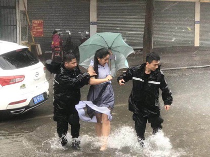 台风期间,一些群众被狂风暴雨阻挡在路上无法回家,一些群众的住所因积水急需转移,警察蜀黍们逆风奔跑,用担架、用冲锋艇,甚至“公主抱”护航群众的安全。