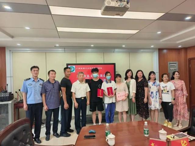 近日,广州市见义勇为基金会理事长蔡巍等人来到广州市第十六中学,对不顾个人安危、挺身而出制止醉汉殴打老人的小龙和小王两名同学进行慰问奖励,现场为他们颁发慰问奖励证书和慰问金。