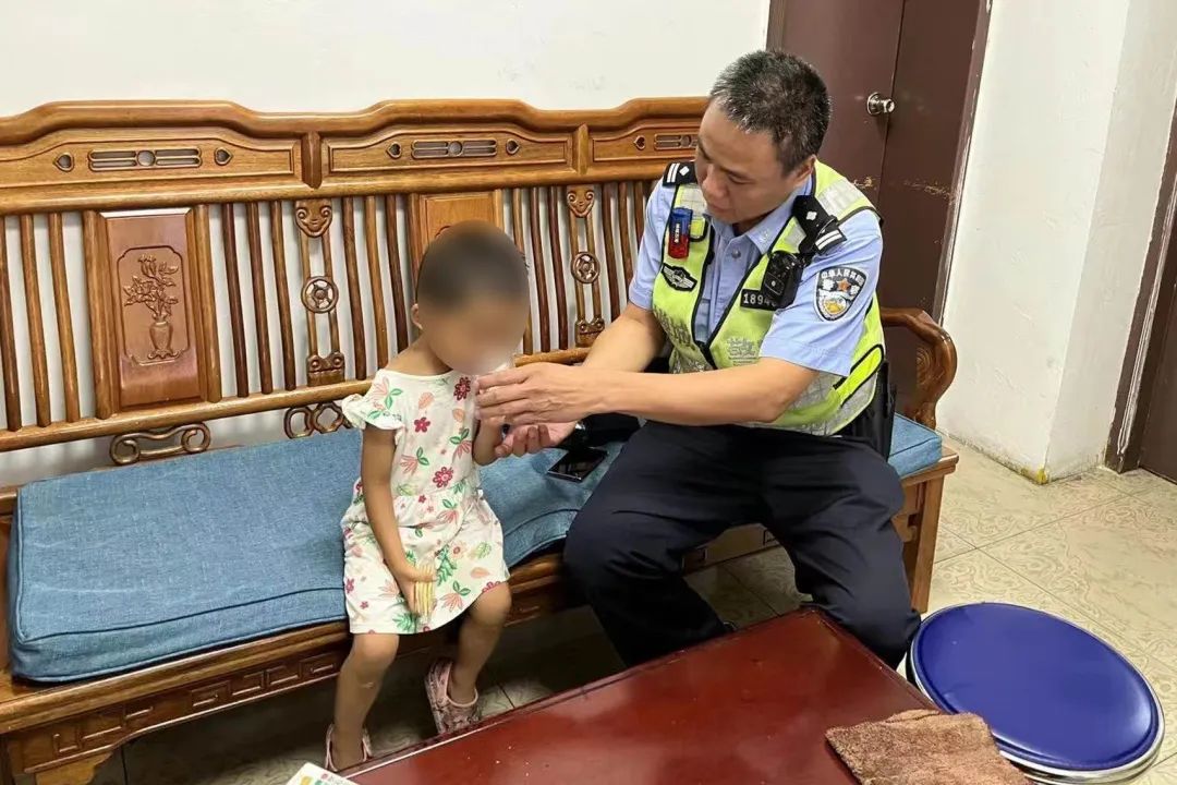 民警尝试与小女孩沟通,但因其年幼,无法说出家属信息,只好先将其带回派出所照顾。回到派出所后,民警连忙帮小女孩擦汗解热,同时递上温水为其补充水分。