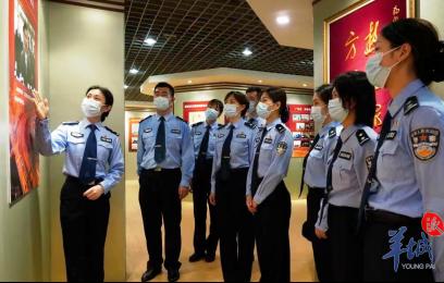 皇岗边检站民警杨欢在站史陈列馆向同事讲解相关情况