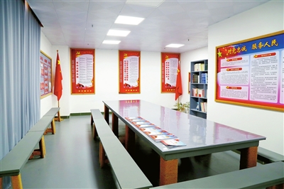 在中心党支部的红色党建长廊和党建活动室,只要稍加留意,便会发现挂在墙上的宣传栏边框乃至座椅凳脚都被麻绳缠绕装饰,到处洋溢着朴素、简洁的元素,成为该党支部党建活动阵地的一大特色。