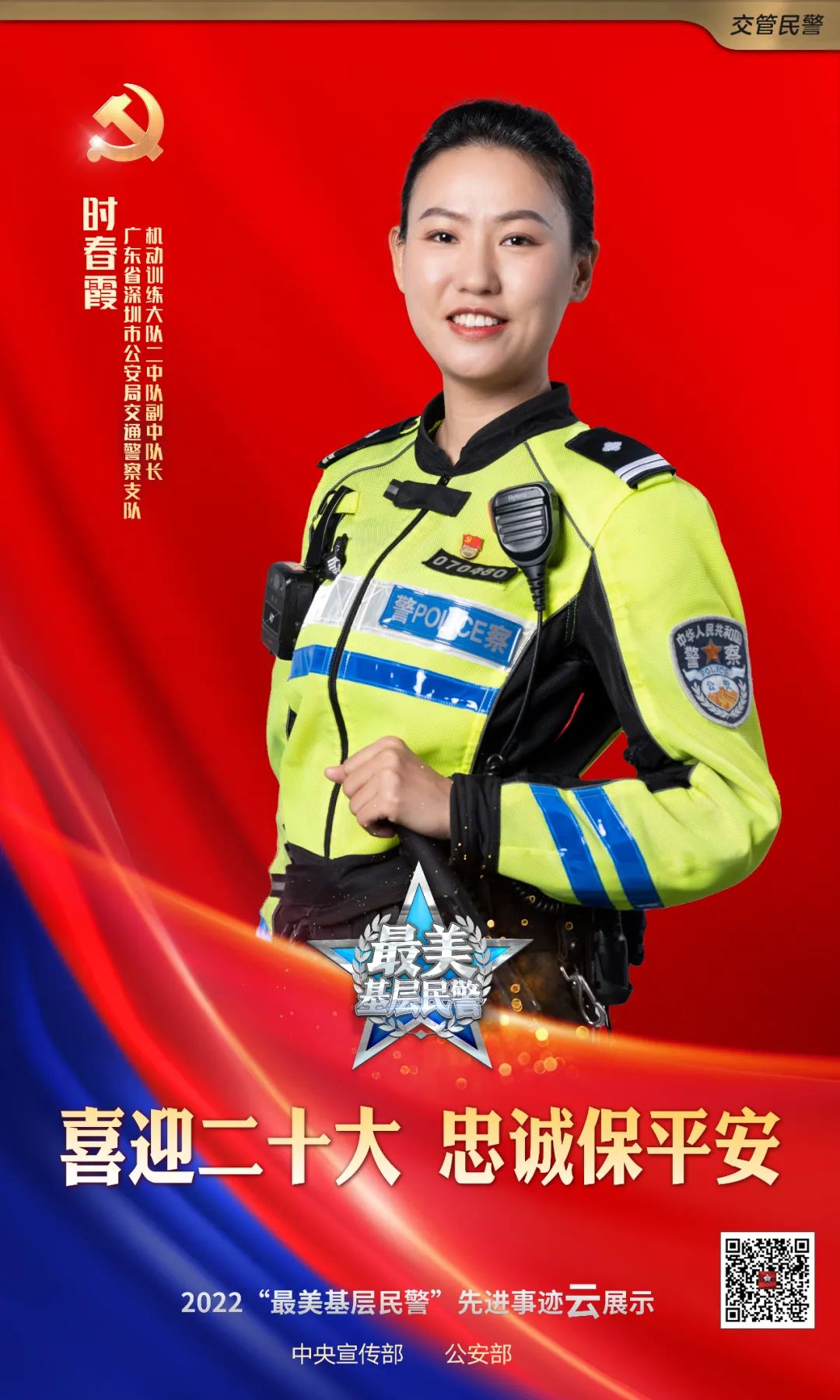 为深入学习贯彻习近平法治思想和习近平总书记关于新时代公安工作的重要论述、重要训词精神,大力弘扬伟大建党精神,激励广大公安民警奋进新征程、建功新时代,中央宣传部、公安部近日向全社会宣传发布2022“最美基层民警”先进事迹。其中包括广东省深圳市公安局交通警察支队机动训练大队二中队副中队长时春霞等38名民警的先进事迹。