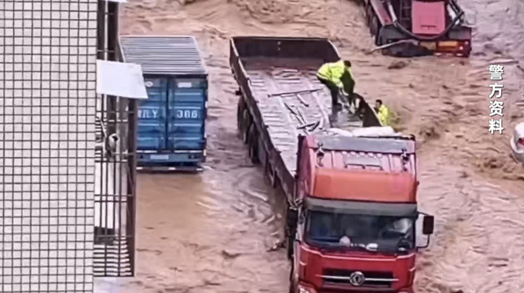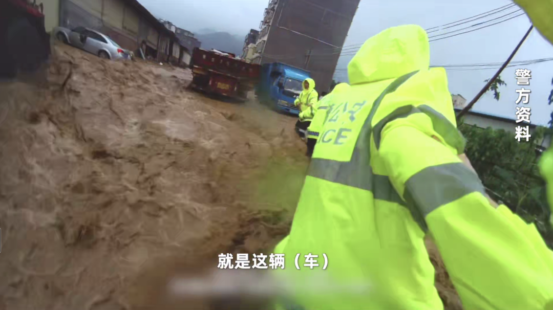 街道被洪水完全淹没,俨然成为一条汹涌的河流。而报警人的车辆横亘于洪流之中,随时有可能被湍急的水流掀翻,情况十分危急。赵腾发等人一边安抚报警人的情绪,一边开展救援。