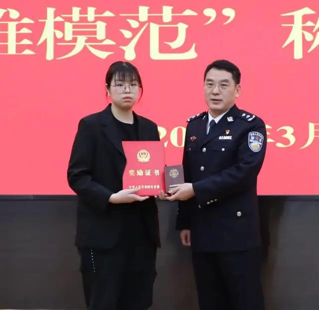 李世全女儿接受广州市副市长、市公安局局长孙太平为李世全颁发的“一级英模”奖章、证书。