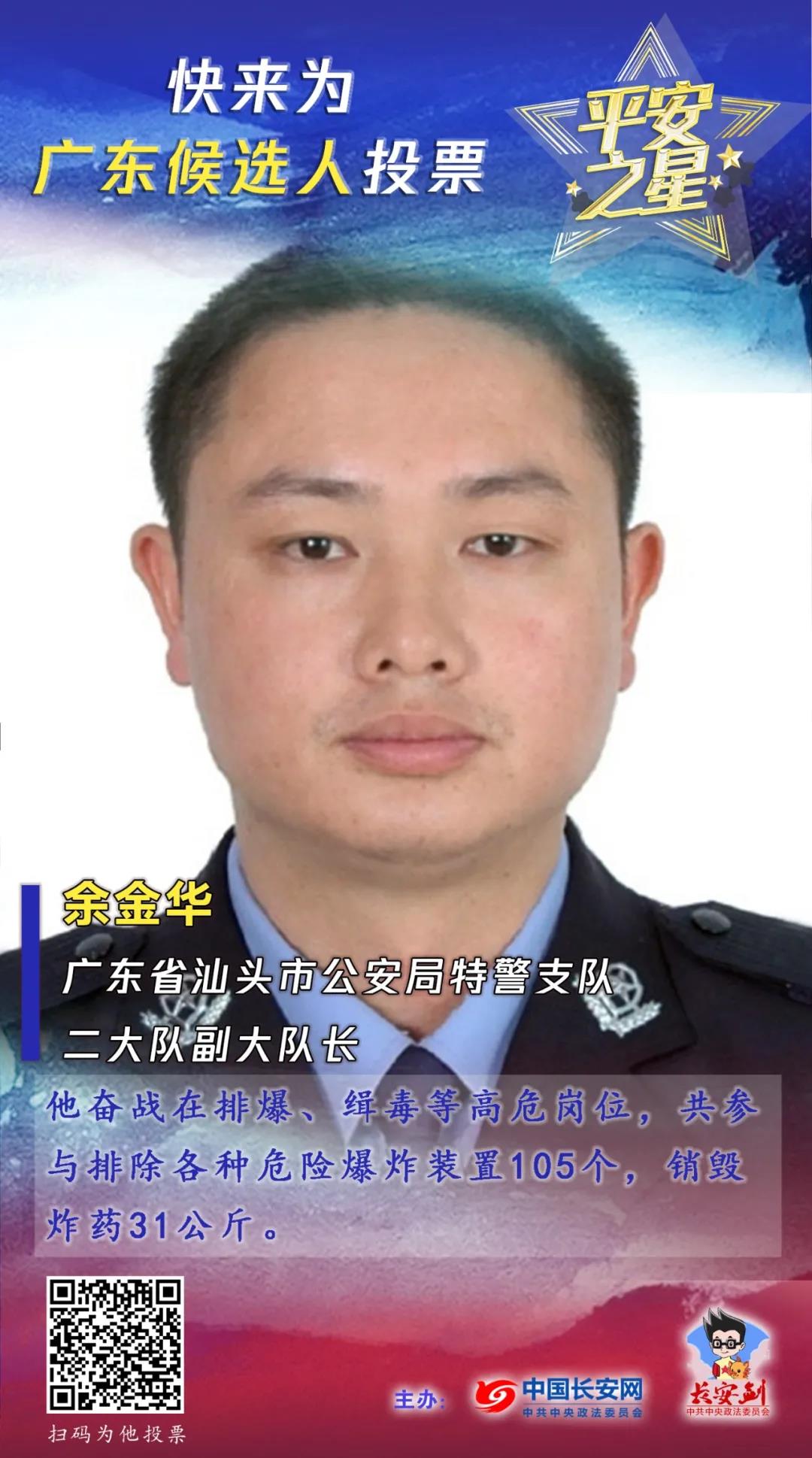 余金华,“平安英雄”候选人,汕头市公安局特警支队二大队副大队长。曾先后被授予全国模范退役军人、全国优秀人民警察荣誉称号;荣立个人一等功1次,二等功1次,三等功2次;获评全警实战大练兵公安部部级“训练标兵”、汕头市先进基层最美党员等荣誉。