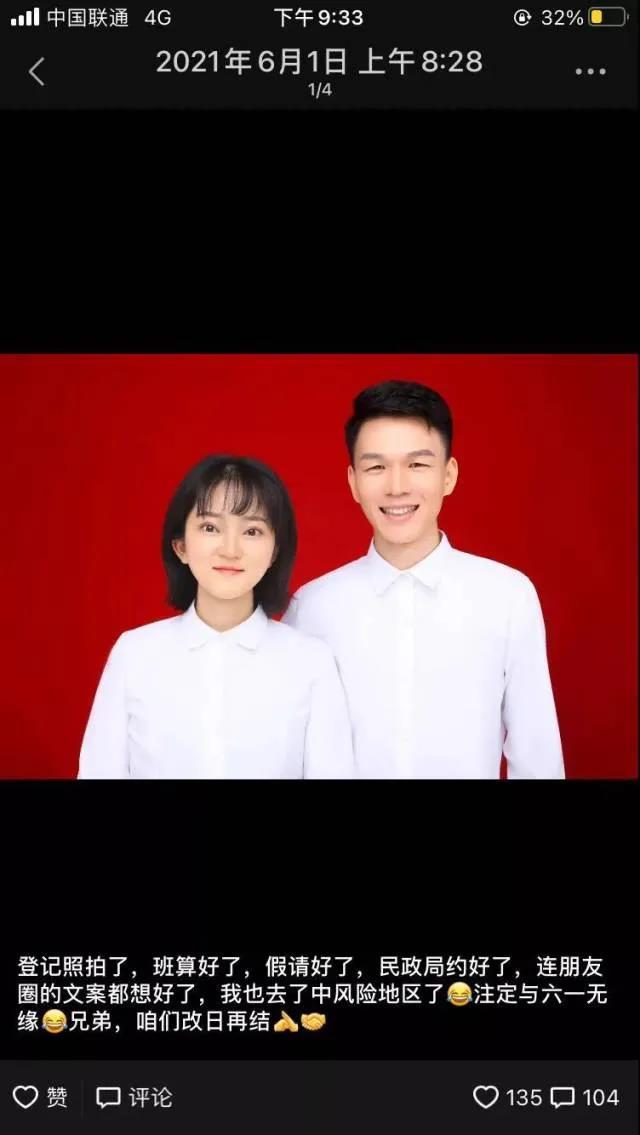 “登记照拍了,班算好了,假请好了,民政局约好了,连朋友圈的文案都想好了,我却去了中风险地区了,注定与六一无缘。兄弟,咱们改日再结。”这条朋友圈的主人是邹雁冰。