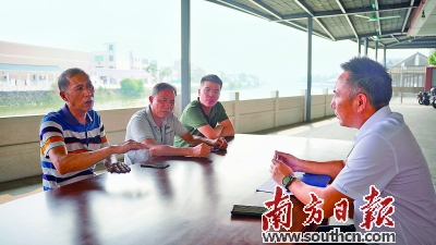 万江街道大汾社区党委书记何裕全正在听取村民建议。何绮莹摄
