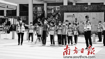 东莞义警为学生维护交通秩序。