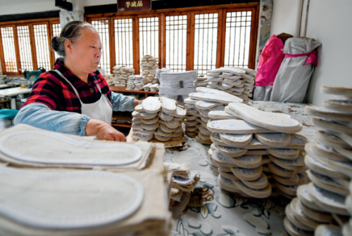 2020年4月17日,成都市郫都区唐昌街道战旗村,赖淑芳整理摆放制作完成的布鞋鞋底。