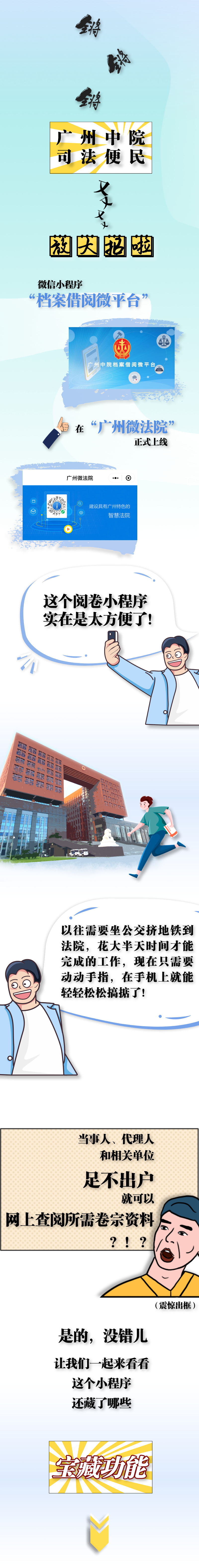 司法创新无止境,司法便民不停步。“广州微法院”将进一步提升和完善用户体验,提高档案利用信息化水平,做好技术对接和机制衔接,为在全市所有基层法院推广使用“档案借阅微平台”小程序做好准备,努力提供更多更优质的一站式诉讼服务,让诉讼服务体系和能力现代化的成果惠及更多群众。