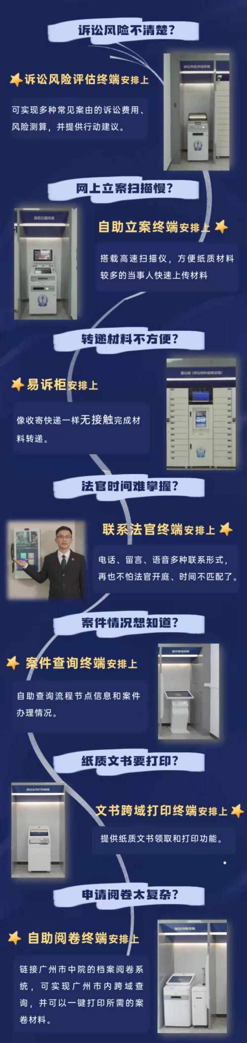 据了解,该诉讼服务中心设有诉讼风险评估终端,可实现多种常见案由的诉讼费用、风险测算,并提供行动建议;设有自助立案终端,搭载高速扫描仪,方便纸质材料较多的当事人快速上传材料;设有易诉柜,像收寄快递一样无接触完成材料转递;设有联系法官终端,电话、留言、语音多种联系形式,再也不怕法官开庭、时间不匹配了;设有案件查询终端,自助查询流程节点信息和案件办理情况;设有文书跨域打印终端,提供纸质文书领取和打印功能;设有自助阅卷终端,链接广州中院的档案阅卷系统,可实现广州市内跨域查询,并可以一键打印所需的案卷材料。