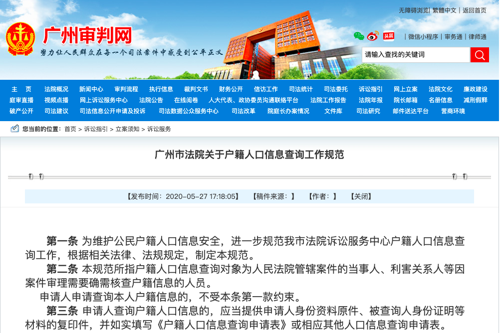 案件当事人、代理人、利害关系人等因案件立案、审理需要,确需核查户籍信息的人员,可前往广州两级法院诉讼服务中心的立案窗口或“e查询”专窗填写《户籍人口信息查询申请表》申请查询。