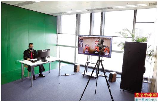 7月13日上午,广州互联网法院一名法官通过“YUE法庭”开庭,法官、人民陪审员实现异地同框参加庭审。