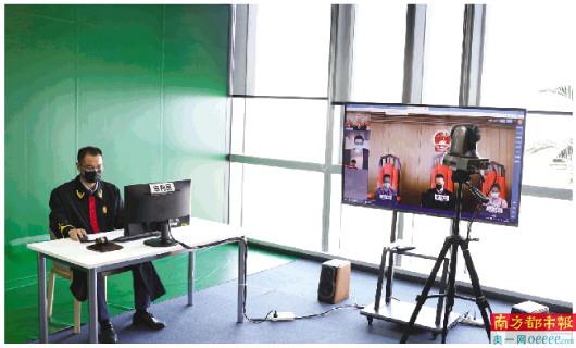 7月13日上午,广州互联网法院一名法官通过“YUE法庭”开庭,法官、陪审员实现异地同框参加庭审。南都记者何玉帅摄