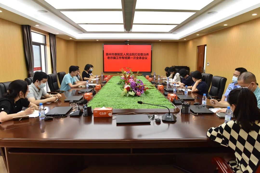惠阳区法院高度重视打击整治养老诈骗专项行动,第一时间制定打击整治养老诈骗专项行动实施方案,成立以党组成员、副院长为组长、各部门精兵强将为成员的养老诈骗专项行动专班,抽调经验丰富的刑事法官组建专门合议庭,确保统筹调度有专班、案件审理有专人,力促全院形成上下贯通、左右联动、运转高效的工作体系。专班成立后,先后多次传达学习上级关于打击整治养老诈骗的文件精神,确保专班成员统一思想认识,提高政治站位,充分认识到打击整治养老诈骗的必要性及紧迫性。