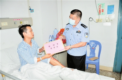 6月5日下午,韶关市公安局、韶关市见义勇为协会、浈江公安分局共同在粤北人民医院住院部为因舍身救火而受伤的退役军人周延涛(男,33岁)颁发了见义勇为奖金,对其见义勇为的行为给予褒奖。